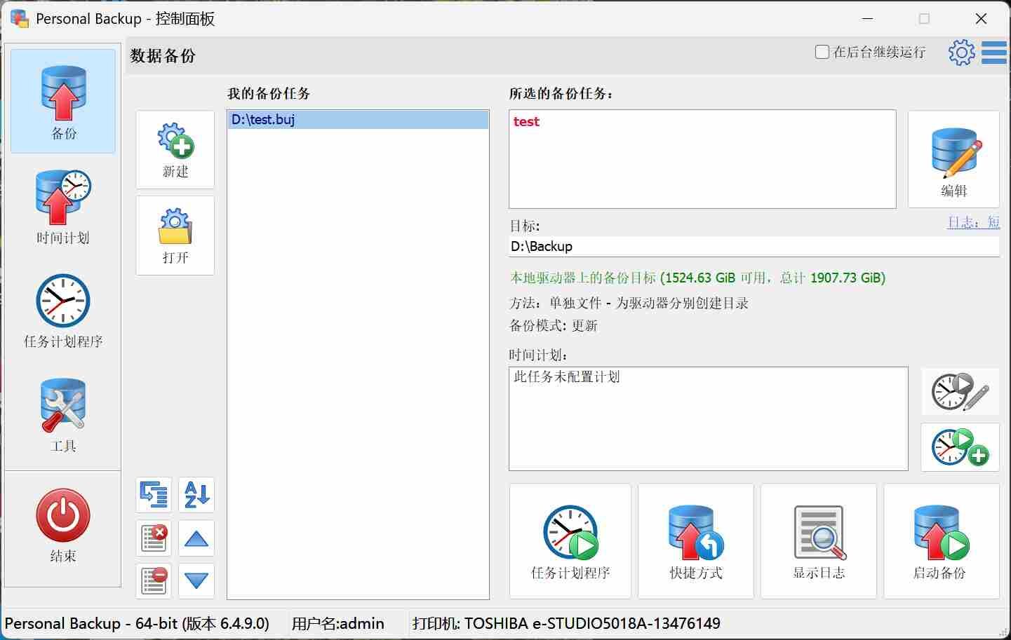 .buj文件创建一个快捷方式。每次下班前,双击这个快捷方式,软件就会静默开始备份,完成后自动退出。 - 使用内置计划任务:点击软件界面的“计划”图标,可以将其添加到 Windows 的自动计划任务中。例如,设置为“每天下午 18:00”,只要电脑开机,时间一到它就会在后台自动执行。