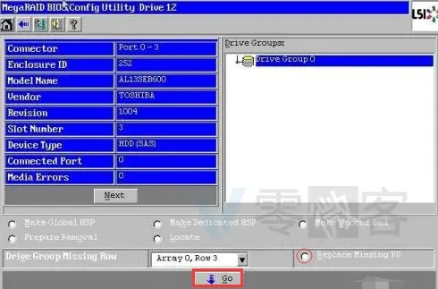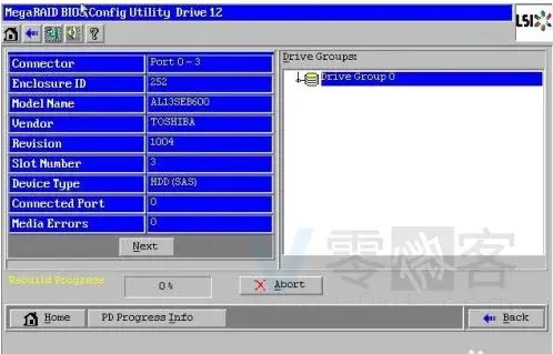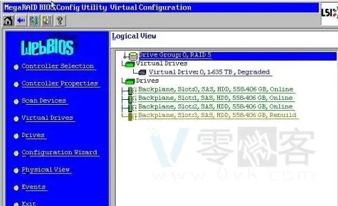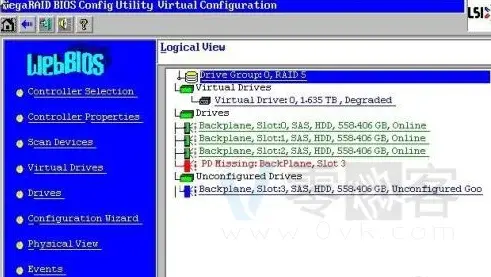 - 进入WebBIOS界面后,可以看到所有硬盘状态,发现三块online,一块unconfigured good。